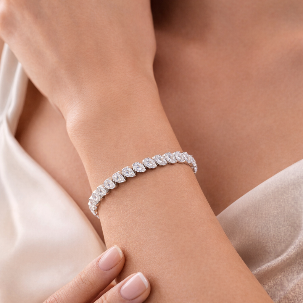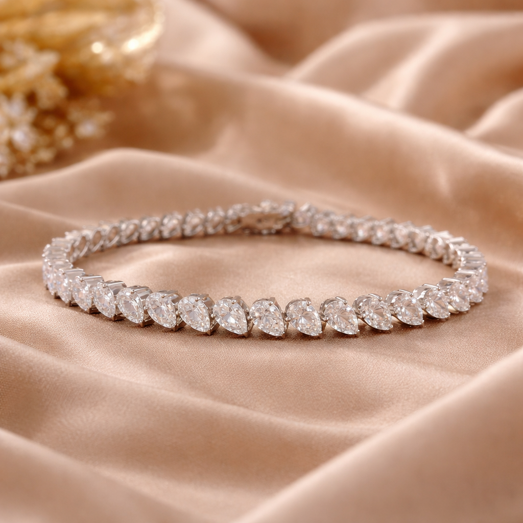 This elegant bracelet showcases a graceful row of pear-shaped lab-grown diamonds, delicately arranged in a flowing leaf-inspired pattern. Each pear shape is precisely set in a sleek white tone finish, creating a continuous rhythm of brilliance and refined sparkle. The pointed silhouette of the diamonds enhances the bracelet’s fluid design, offering a modern yet timeless appeal. Perfect for statement styling or elevated everyday wear, this piece combines sophistication with luminous charm.