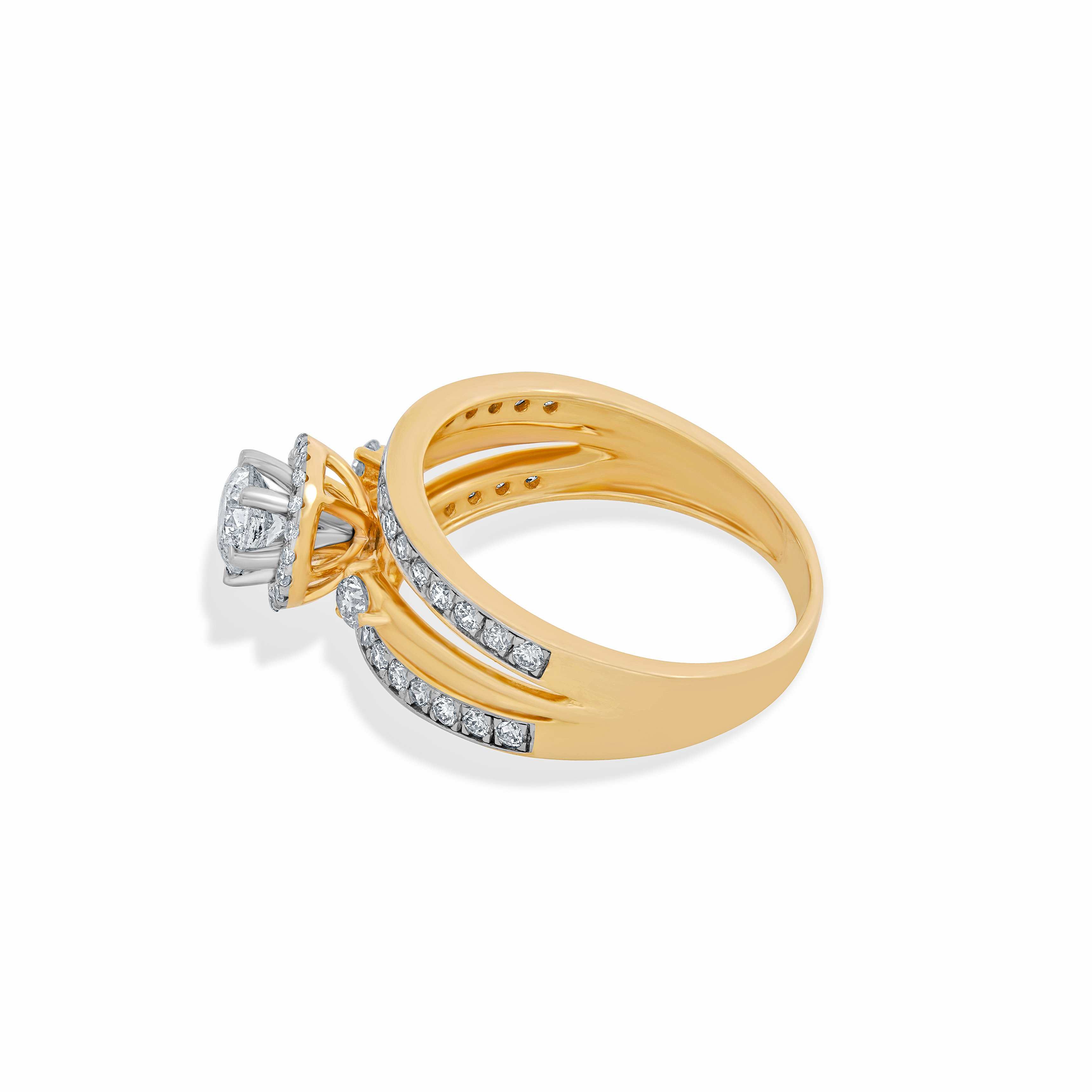 Crafted in lustrous gold, this exquisite ring features a dazzling central diamond embraced by a radiant halo of meticulously embedded microdiamonds.