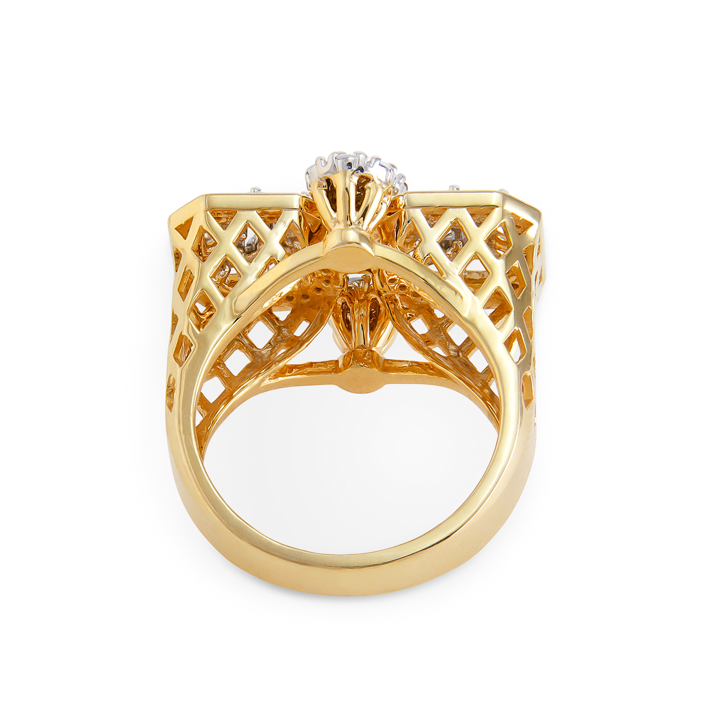 The band of the ring is crafted with meticulous attention to detail, each square and circular motif. Each square and circle is embedded with dazzling diamonds, creating a continuous steam of shimmer and sparkle. The diamonds are carefully selected for their exceptional quality and radiance.