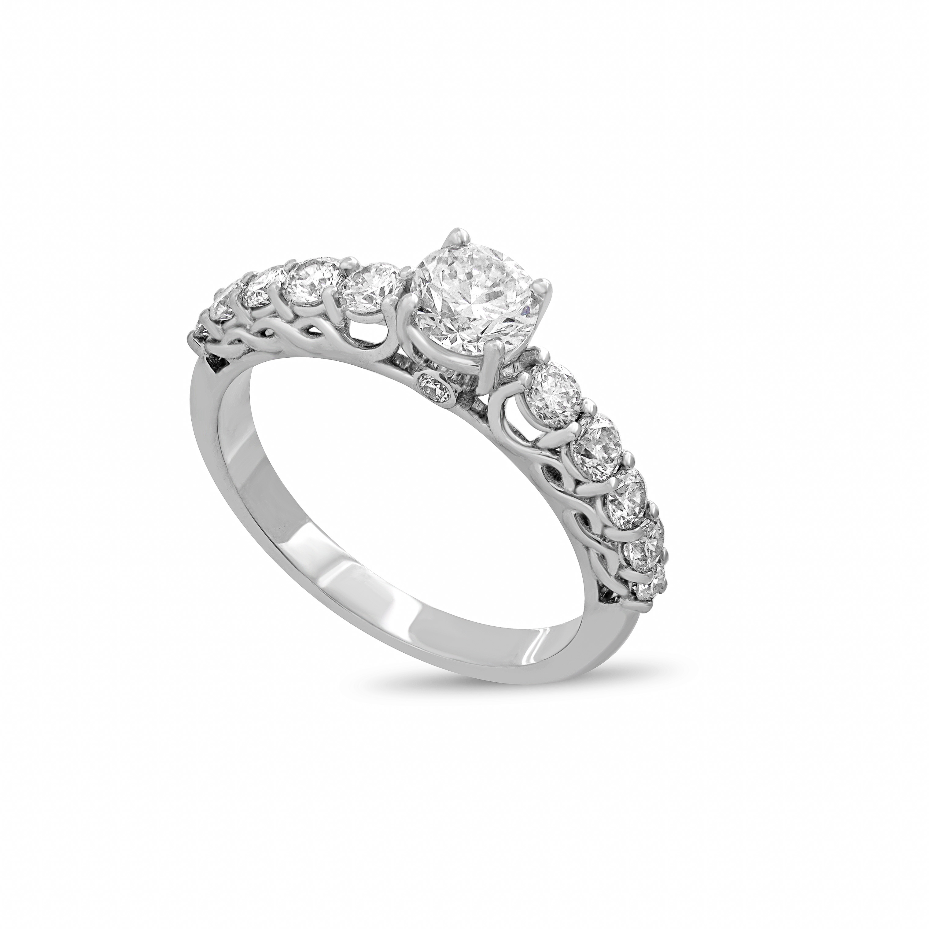 The band of the ring is crafted in lustrous white gold, providing a rich and regal backdrop for the exquisite diamonds.